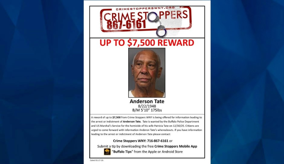 Buffalo police, now supported by the U.S. Marshals, are searching for Anderson Tate, following the discovery of 70-year-old Patricia Tate late last year, according to WIVB.